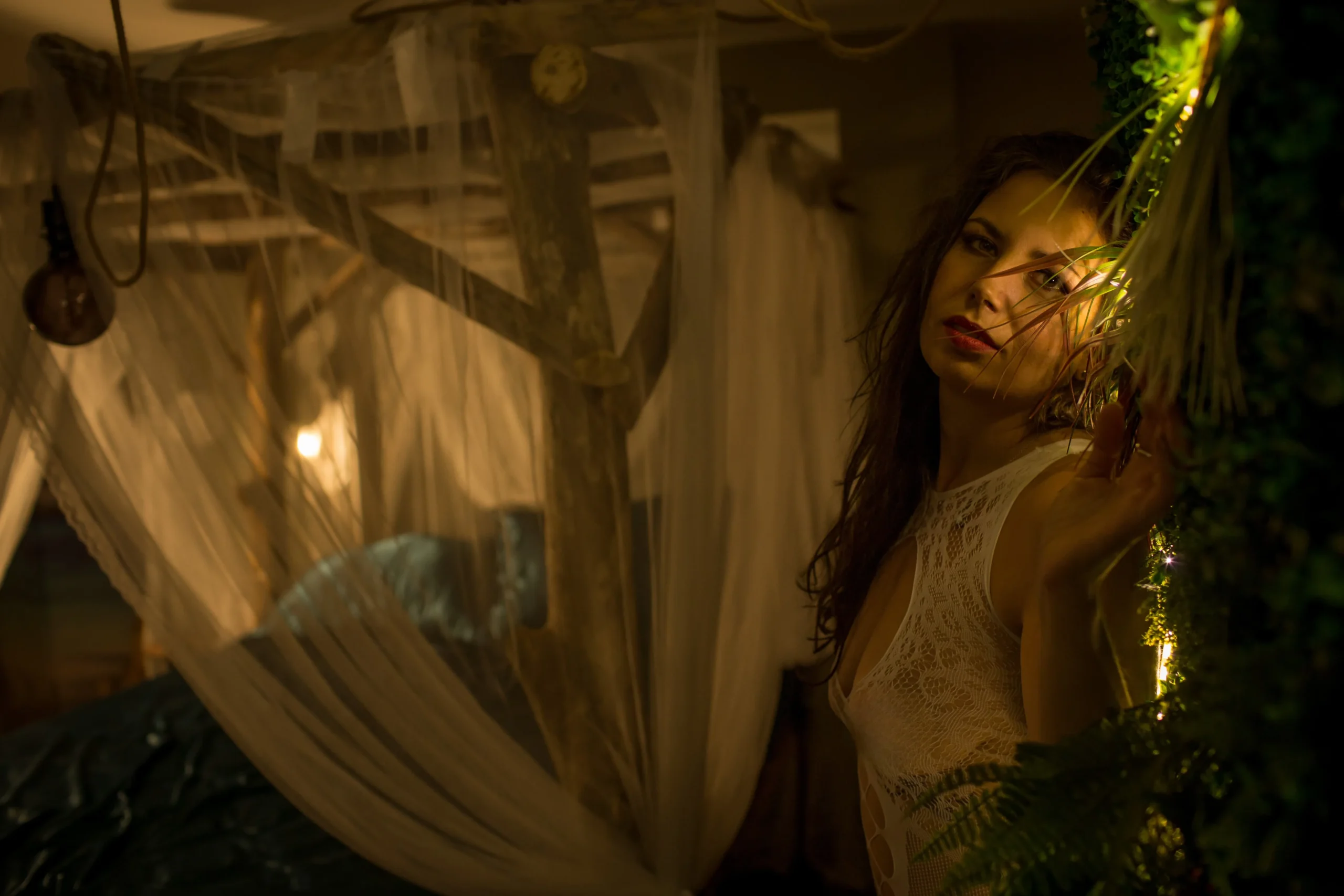 Atmosphère chaleureuse et feutrée : un somptueux lit à baldaquin en bois flotté, une lumière délicatement tamisée et une décoration raffinée. L’écrin idéal pour les couples en quête de romantisme